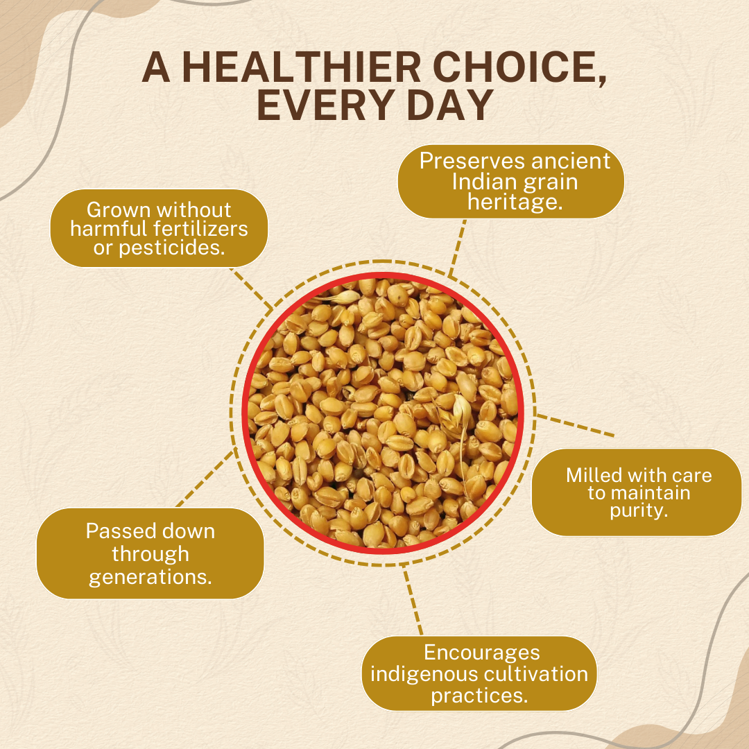 Sona Moti is a 2000-year-old desi variety of emmer wheat, grown without the use of fertilizers or pesticides.