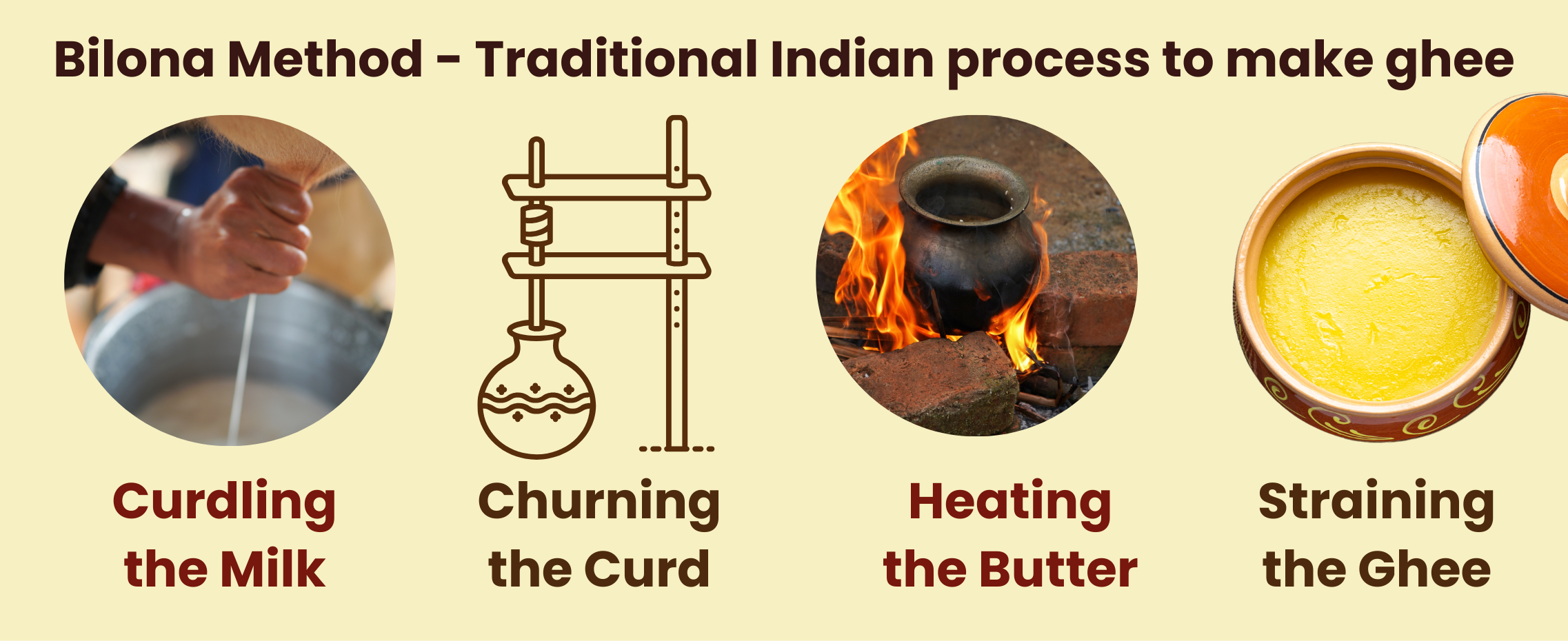 TheBilona method is a traditional Indian process used to make ghee, particularly desi cow ghee. It involves several key steps that ensure the ghee is pure, rich in nutrients, and has a distinctive flavor. Here's how it works:
